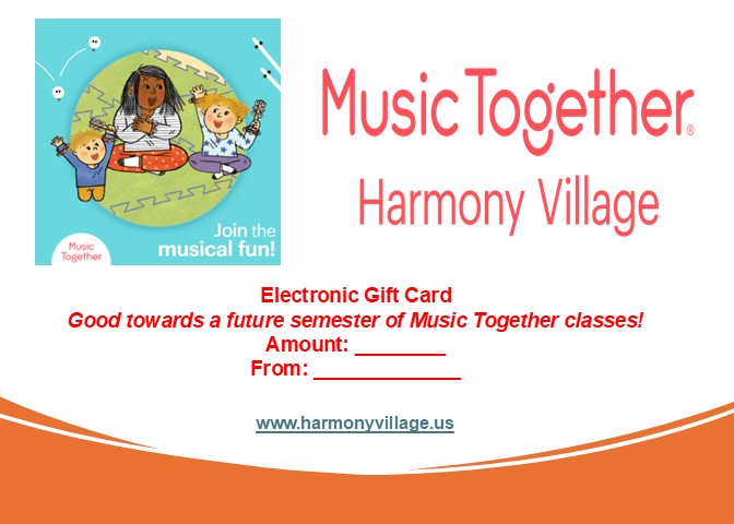 These gift cards can be purchased in any amount, from $25 to $300, and can be used towards a semester of Music Together classes!